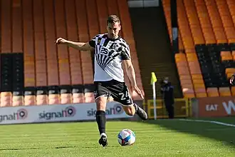 The new year began with a 4–0 defeat at Mansfield Town thanks to a Jordan Bowery hat-trick and Legge being sent off for the second time of the season; speaking in his post-match interview, Askey alluded to "a lot of strange happenings going", saying that "it’s not a level playing field at the moment".[42] This proved to be Askey's last game in charge and he left the club on 4 January, with coach Danny Pugh stepping in as caretaker manager.[1] Pugh made Conlon the new club captain.[43] Pugh selected a 4–4–2 formation for first game in charge, a 3–0 home win over Grimsby Town that proved to be a stark contrast to their defeat seven days previously.[44] The club then signed Jake Taylor, a 22-year-old midfielder who had impressed on loan from Nottingham Forest the previous season, to a three-and-a-half-year deal.[45] With Pope ruled out injured for the rest of the season, the club also brought in striker Kurtis Guthrie after he secured his release from Bradford City.[46] In order to comply with EFL squad limit rules the club deregistered Harry McKirdy and Theo Robinson so as to make room for the two new signings.[47] Guthrie started on the bench at Forest Green Rovers on 16 January, which ended as a 1–1 draw following a late equalising goal from Rodney.[48] However, two days later, Pugh had to start self-isolation after testing positive for COVID-19; his assistants – Frank Sinclair, Billy Paynter and Anthony Griffith took over first-team duties in his absence.[49] They oversaw a 3–1 defeat to Walsall in which Brown played poorly and allowed a weak back-pass to bobble over his foot and into the back of the net.[50] The bad run continued at Scunthorpe, as poor defending allowed a brace from Ryan Loft to condemn Vale to a 2–0 loss;[51] stand-in manager Frank Sinclair said that "it wasn’t good enough, especially the first half".[52] Pugh returned to the touchline in time to oversee a 5–1 victory over bottom-club Southend United, who Pope described as "the worst professional side I have ever seen".[53][54] On transfer deadline day the club signed 19-year-old centre-back Mustapha Olagunju on loan from Huddersfield Town and 20-year-old striker Will Swan on loan from Nottingham Forest.[55][56]