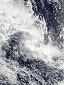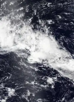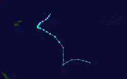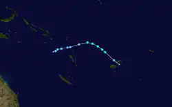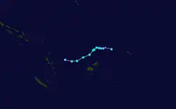 During December 8, the FMS reported that Tropical Disturbance 01F had developed about 145 km (90 mi) to the northeast of Apia in Samoa.[4] At this stage, the system had a broad low level circulation and was located within a marginal environment for further development, with warm sea surface temperatures as well as moderate levels of vertical wind shear.[5] Over the next couple of days, the system gradually moved westwards before the FMS classified it as a tropical depression during December 11, while it was located about 280 km (175 mi) to the west of the Fijian Dependency of Rotuma.[6] At 00:00 UTC on December 11, the JTWC upgraded the system to a tropical storm on the Saffir–Simpson hurricane wind scale.[7] The depression continued to consolidate, with deep convection wrapping into the centre of the system from the northern semicircle, and by 12:00 UTC, one-minute sustained winds had increased to 75 km/h (45 mph).[8] A few hours later, the FMS estimated maximum 10-minute sustained winds to be at 55 km/h (34 mph), with a minimum central atmospheric pressure of 998 hPa (29.47 inHg).[9] However, environmental conditions were only marginally conducive for intensification, with strong vertical wind shear inhibiting further development.[8] By 00:00 UTC on December 12, both the JTWC and the FMS reported that the shear had displaced the system's deep convection to the northeast, leaving the center of circulation fully exposed.[10][11] Due to the deteriorating structure of the system, the FMS ceased advisories on Tropical Depression 01F at this time.[11] The storm then weakened and degenerated into a low pressure system later on December 12. Because of the Fujiwhara effect, the remnant was absorbed by Tropical Depression 02F shortly afterward, which would later become Severe Tropical Cyclone Yasa.[12]