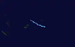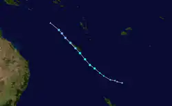 On February 7, a weak tropical disturbance formed near the Lau Island of Cikobia-i-Lau, to the north of Nadi, Fiji.[63] The JTWC issued a TCFA on the disturbance at 15:00 UTC the next day, designating it as Invest 92P.[64] It strengthened to a tropical depression as it tracked to the south. However, the FMS ceased their warnings on 09F as it moved out of the tropics.[65] The JTWC on the other hand had upgraded the system to Tropical Cyclone 20P early on February 10, with 1-minute sustained winds of 85 km/h (53 mph).[66] However, the JTWC also issued their final warning on 09F as it accelerated south-southeastward and became extratropical.[67]