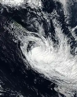 During December 11, the FMS reported that Tropical Disturbance 03F had developed about 480 km (300 mi) to the northeast of the island nation of Niue.[6] Deep convection near the system was initially only fragmented; however, environmental conditions were assessed as being conducive for development, with low vertical wind shear, good upper-level outflow and sea surface temperatures near 29 °C (84 °F).[9] The system's organisation improved steadily over the next few days, and at 12:00 UTC on December 13, the Joint Typhoon Warning Center (JTWC) upgraded the depression to a tropical storm on the Saffir-Simpson hurricane wind scale.[25] Zazu continued to strengthen even as it began extratropical transition, reaching Category 2 status on the Australian scale on December 15, despite struggling with the effects of westerly wind shear.[26] During December 16, the system moved into MetService's area of responsibility, before they reclassified it as an extratropical low later that day.[27] Zazu's extratropical remnant continued southward for another day, before turning eastward on December 18, and dissipating a day later.