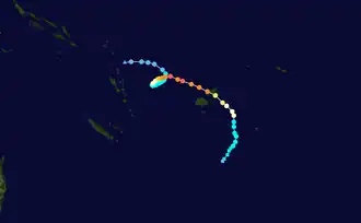 The storm continued to intensify and soon became a Category 3 on the Australian scale. Just about 12 hours later on December 14, Yasa rapidly intensified to Category 4 status on the Australian scale as a defined eye began to clear on infrared satellite imagery.[21] The storm continued rapidly intensifying and strengthened to a Category 5 tropical cyclone on the Australian scale, the highest rating possible, while completing its loop, with a central pressure of 929 mbar and wind speeds of 110 knots (125  mph).[22] This was the earliest date a Category 5 South Pacific tropical cyclone formed on record and only the second Category 5 South Pacific tropical cyclone recorded in December. Yasa continued its rapid intensification trend and further intensified to the equivalent of a high-end Category 4 tropical cyclone on the Saffir–Simpson scale (SSHWS), developing a well-defined and obvious eye, while continuing to become more symmetrical.[23] By 00:00 UTC on December 16, Yasa had intensified into a Category 5-equivalent tropical cyclone on the SSHWS, with 1-minute sustained winds of 260 km/h (160 mph). At 18:00 UTC, Yasa's maximum 10-minute sustained winds increased to 230 km/h (140 mph), with a minimum atmospheric pressure of 917 hPa (27.08 inHg),[24] making the system one of the most intense tropical cyclones ever recorded in the Southern Hemisphere. After making landfall on Vanua Levu, Yasa moved into an area of unfavorable conditions, causing the storm to rapidly weaken, with Yasa weakening into a Category 3 severe tropical cyclone later that day. Yasa continued its weakening trend as it turned southward, dropping to Category 1 tropical cyclone status in late December 18. Late on December 19, Yasa transitioned into an extratropical storm, and the FMS issued their final advisory on the storm. Afterward, Yasa's extratropical remnant moved southward and then eastward, before dissipating on December 24, to the northeast of New Zealand.