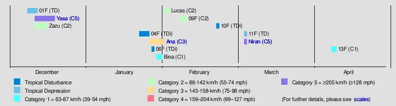 The season began with the formation of Tropical Depression 01F, over a month after the official start. Despite the slightly late start, activity picked up, with two more systems forming after. In mid-December, Severe Tropical Cyclone Yasa became the earliest category 5 severe tropical cyclone on record in the South Pacific basin. Yasa struck Fiji, resulting in heavy damage. Severe Tropical Cyclone Ana and Tropical Cyclone Bina also affected Fiji within days of each other, resulting in heavy rains and strong winds. Tropical Cyclone Lucas crossed into the basin from the Australian region and affected the Loyalty Islands. In early March, Cyclone Niran moved into basin from the Australian region as a Category 5 severe tropical cyclone. The storm passed close to New Caledonia, bringing heavy impact, before transitioning into an extratropical cyclone north of New Zealand.