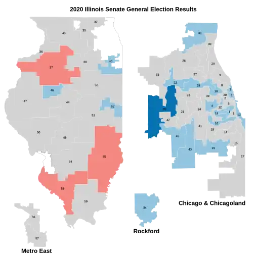 The 2020 elections for the Illinois Senate took place on November 3, 2020, to elect senators from 22 of the state's 59 Senate districts to serve in the 102nd General Assembly, with seats apportioned among the states based on the 2010 United States census. Under the Illinois Constitution of 1970, senators are divided into three groups, each group having a two-year term at a different part of the decade between censuses, with the rest of the decade being taken up by two four-year terms.[1] The Democratic Party has held a majority in the Senate since 2003. The inauguration of the 102nd General Assembly occurred on Wednesday January 13, 2021.[2]