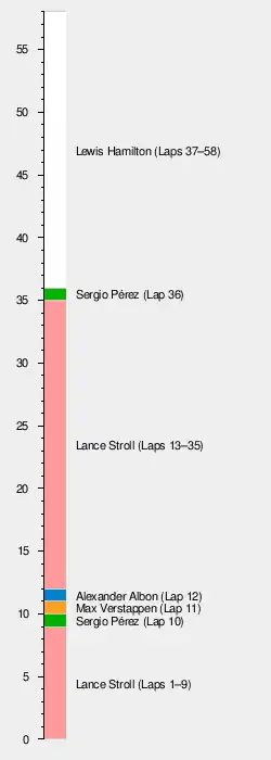 Stroll held onto the lead after starting from pole position, while his teammate Pérez moved up from third place into second.[4] This was the first time Stroll had led a lap of a world championship Grand Prix.[1] Both Red Bull drivers accelerated slowly from the standing start, and were overtaken by other drivers who started behind them,[93] with Verstappen falling from second to eighth place at the start.[94] Much of the grid chose to launch in second gear, but the drivers of the two Honda powered teams (Red Bull and AlphaTauri) all chose to start in first gear.[95]