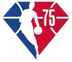 On July 7, 2021, the NBA announced that it would commemorate its 75th anniversary throughout the 2021–22 season. A 75th-anniversary diamond jubilee logo is featured in promotions across all NBA properties during the season, including on merchandise, digital and social media, and painted on the courts.[4][5] It also announced its 75th anniversary team, honoring the greatest players in NBA history, as chosen by a panel of media, current and former players, coaches, general managers, and team executives.[6] All NBA uniforms feature the Nike (Association, Icon, and City uniform) and Jordan Brand (Statement and Charlotte Hornets uniform) logos in a diamond embellishment, while the normal NBA logo on the back was modified to also feature diamond embellishments and the NBA mark replaced by the number 75.[7]