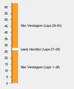 Just before the restart, Verstappen almost spun at Rivazza, but managed to maintain control; he kept the lead and pulled away for the rest of the race.[30] Behind him, Lando Norris overtook the Ferrari of Charles Leclerc for second place, while Perez and Yuki Tsunoda spun at Villeneuve and Tamburello respectively, dropping them down to 14th and 15th.[28] Hamilton, starting ninth after the red flag, worked his way upwards through the field, and eventually managed to pass the stubborn McLaren of Norris for second place on lap 60.[32] Norris achieved his second podium with third-place, following an equal placing at Austria the previous year. Hamilton claimed the bonus point for fastest lap, allowing him to maintain the lead in the championship over Verstappen.[36]