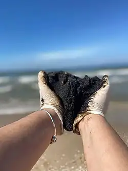 The 2021 Mediterranean oil spill was an ecological disaster which occurred in February 2021 along the Mediterranean coast of Israel and Lebanon. Starting on 16 February 2021, dozens to hundreds of tons of tar washed up on the beaches along a 160-kilometre (99 mi) stretch of Israel's coast from Rosh Hanikra to Ashkelon, following a heavy storm and unusually high waves.[1][2][3] Tar deposits also heavily impacted the beaches in south Lebanon.[4] European Sentinel satellite photos showed 12 apparent oil slicks at various distances from the shore between 11 and 13 February 2021 according to Greenpeace.[5]