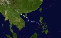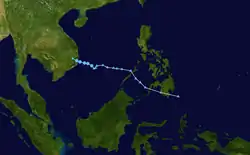 On June 10, the JTWC started to monitor an area of low-pressure in the South China Sea, approximately 518 km (322 mi) to the south of Hong Kong, with the agency classifying the system as a monsoon depression.[85] Tracking west-northwestward, the storm was located in a favorable environment for further development, with warm sea surface temperatures and low wind shear.[86] At 00:00 UTC on June 11, the JMA upgraded the system into a tropical depression.[87] Six hours later, the JTWC issued a TCFA for the system as it began to show characteristics of a monsoon depression.[88] By 18:00 UTC, the JMA upgraded the system to a tropical storm, assigning it the name Koguma.[87] On June 12 at 00:00 UTC, the JTWC upgraded Koguma to a tropical depression, assigning it the designation 05W.[89] Later that day, the JTWC also upgraded Koguma to a tropical storm.[89] By June 12, it had made landfall southeast of Hanoi,[90] and dissipated the next day.[87]