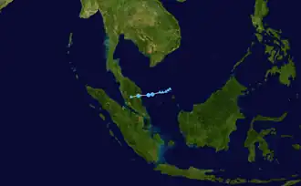 On May 11, the JTWC noted a persistent area of convection in the Philippine Sea, approximately 184 nmi (341 km) west of Palau.[41] The JTWC issued a TCFA for the convection on May 12, as it further developed in an environment with low vertical wind shear and warm sea surface temperatures.[42] Just three hours later, the agency recognized that the area of convection had quickly consolidated into a tropical depression and assigned it with the identifier of 03W.[43] Around the same time, the JMA had also recognized the storm as a tropical depression while it was to the east of Mindanao.[44] Since the storm developed within the Philippine Area of Responsibility, the PAGASA immediately named the storm Crising once the agency recognized it as a tropical depression as well, and later raised Signal No. 2 warnings for areas in Mindanao.[45][46] In the early hours of May 13, the JTWC upgraded the system into a tropical storm, with the PAGASA following suit hours later.[47][48] Later that day, Crising's low-level circulation center became exposed due to wind shear, and it lost organization. At 8:20 p.m. Philippine Standard Time (12:20 UTC), Crising made landfall in Baganga, Davao Oriental as a weakening tropical storm. It quickly degraded as soon as it made landfall, with both the JTWC and the PAGASA downgrading it to a tropical depression at 15:00 UTC.[49][50] At 03:00 UTC on that day, the PAGASA reported that the system degenerated to an area of low-pressure in the vicinity of Piagapo in Lanao del Sur, thus lifting all warning signals on Mindanao and issuing their final advisory.[51] On May 14, the system dissipated over the Sulu Sea, and both the JMA and the JTWC issued their final advisories on the storm.