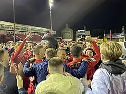 The next four games saw Shelbourne draw at home to Bray Wanderers, win at home against Wexford, and win away to Cobh and Cabinteely. A win at home to Treaty United on 1 October 2021 would see Shelbourne secure promotion, and Georgie Poynton's 74th minute spot kick secured the 1–0 victory. At the final whistle fans burst onto the Tolka Park pitch to celebrate the return to the Premier Division with players and staff.[15] The next two games saw a 1–1 draw at home to Athlone Town and a 0–2 defeat away to Cobh.