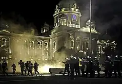 Later that year, the Alliance for Serbia (SzS) was formed by Đilas, along with Vuk Jeremić, Zoran Lutovac, and Boško Obradović.[9] It was a major opposition alliance, that also played a key role in the 2018–2020 protests,[10] and it boycotted the 2020 parliamentary election.[11] Municipal elections were held in Belgrade after the parliamentary election, in which, SNS won a majority in all 16 Belgrade municipalities except New Belgrade,[12] where the Serbian Patriotic Alliance (SPAS), which was led by Aleksandar Šapić, managed to form a local government, third time in a row.[13] During that period, protests erupted in Belgrade over the announcement of the reimplementation of the curfew and government's allegedly poor handling of the COVID-19 pandemic. The demonstrators took to the streets, stormed the National Assembly building, and clashed with the police.[14] The clashes and riots continued for the next few days, while the police used excessive force.[15]