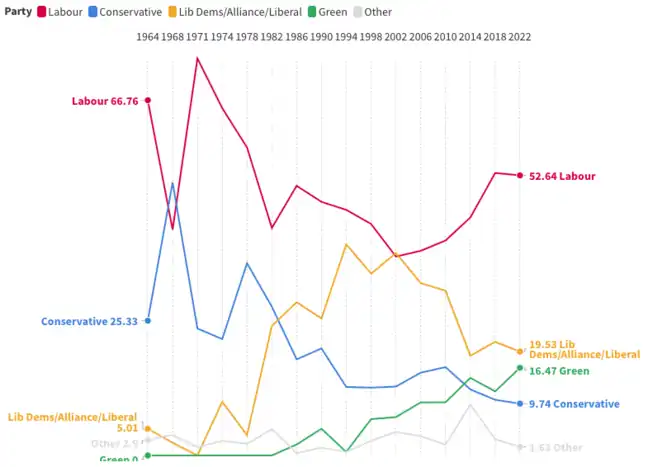 Since its formation, Southwark has been continuously under Labour control, apart from a period of no overall control from 2002 to 2010. Apart from an independent in 1982 and a Green Party councillor in 2006, all councillors have been from the Labour Party, Liberal Democrats or the Conservative Party. Labour regained its majority in the 2010 election, winning 35 seats with the Liberal Democrats on 25 and the Conservatives on three. Labour extended its majority by winning 48 seats in the 2014 election with the Liberal Democrats on 13 seats and the Conservatives on two. The Conservatives lost all their representation in the most recent election in 2018, with Labour winning 49 seats with 53.09% of the vote across the borough and the Liberal Democrats winning the remaining 14 seats with 21.36% of the vote. The Green Party received 12.04% of the vote and the Conservatives received 10.46% of the vote but neither party won any seats.[2] The incumbent council leader, Peter John, was reappointed following the election.[3]