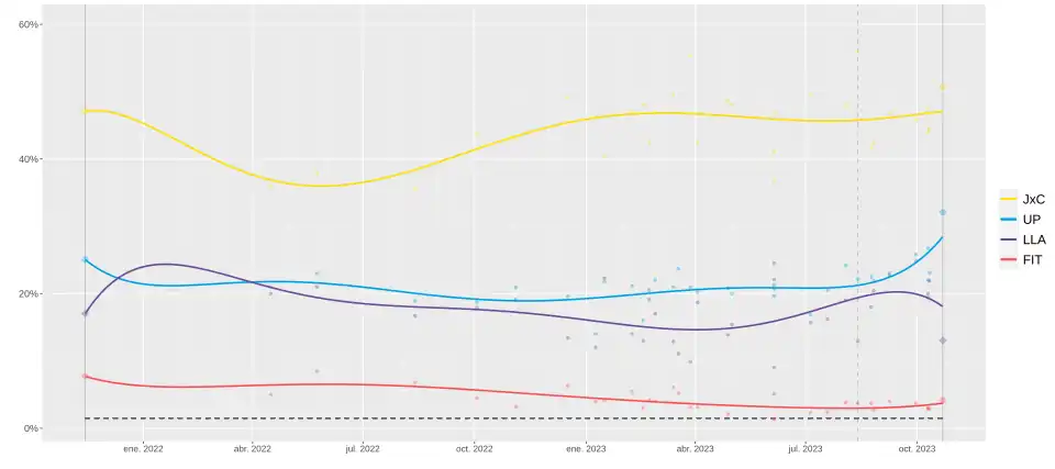 | Federico González & Asociados[9] | 6-8 Sep 2023 | 1,000 | 46.7 | 23.0 | 22.7 | 4.0 | – | 3.3 | 7.5 | 23.7 |