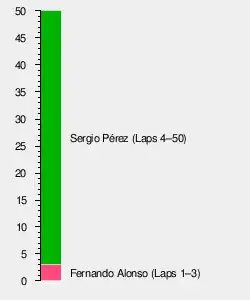 The safety car left the track at the end of lap twenty to allow normal racing to resume. Pérez led from Alonso, ahead of Russell in third and Verstappen now fourth. Sainz completed the top five. Over the next two Laps, Hamilton passed Sainz for fifth place and Verstappen Russell for third respectively. At the end of the following lap Verstappen passed Alonso to move into second place.[28]