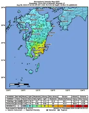 On 8 August 2024, at 16:42:55 JST (07:42 UTC), a Mw 7.1 earthquake struck in the Hyūga Sea off the coast of Miyazaki Prefecture, Kyushu, Japan, 20 km (12 mi) northeast of Nichinan.[2] The earthquake resulted in injuries to 16 people, and triggered extended emergency measures in Japan due to fears of a more powerful earthquake along the Nankai Trough.