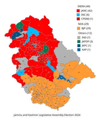 - ^ a b Naveed Iqbal; Arun Sharma; Bashaarat Masood (8 October 2024). "Jammu Kashmir Election Results 2024 Live: NC-Cong alliance set to form govt after first polls in a decade, BJP emerges second largest party". Indian Express.
