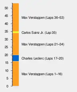 Polesitter Max Verstappen, driving for Red Bull, led the race into the first corner before a crash involving Daniel Ricciardo and Alexander Albon neutralised the race for over twenty minutes while the tyre barriers had to be repaired.[16] Following the red flag period, the race restarted with a standing start on lap three. On lap 12, Sauber driver Zhou Guanyu retired due to a gearbox problem, the third retirement of the race. Verstappen remained unchallenged, eventually making his pit stop on lap 16. This handed the lead of the race to Ferrari's Charles Leclerc, but Verstappen, who had a significant tyre advantage, closed the gap to Leclerc and by lap 20 retook the lead.[16] By that point, it became clear that Leclerc was performing a one-stop strategy on his medium tyres, and swapped to hards by the end of lap 26. Leclerc's one-stop strategy would prove effective, while the Mercedes drivers of Lewis Hamilton and George Russell, who had swapped to hards during the red-flag period, were struggling with tyre degradation.[16] A brief yellow flag period was observed on lap 42, after Logan Sargeant in the sole remaining Williams drove into the gravel at turn 9, but was able to reverse back on track and continue.[17] As the race entered its final laps, Carlos Sainz Jr. overtook Leclerc for the last spot on the podium behind Verstappen's teammate Sergio Pérez.[16] Russell attempted to overtake Oscar Piastri at turn 16 in the closing laps; Piastri temporarily maintained his position, but on the final lap Russell successfully overtook Piastri to finish in seventh.[17] Yuki Tsunoda of RB scored one point in tenth, the first Japanese Formula One driver to score a point at their home race since Kamui Kobayashi's podium at the 2012 Japanese Grand Prix.[18]