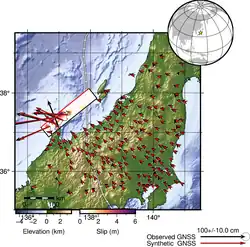 According to a finite fault model released by the USGS, the earthquake rupture extended over 160 km (99 mi) by 20 km (12 mi) from the southwestern Noto Peninsula to Sado Island along a southeast-dipping fault. Slip was mostly concentrated entirely beneath the peninsula. The zones of the largest slip occurred southwest of the hypocenter while little to no slip occurred on the segment offshore between the peninsula and island. The patch immediately southwest of the epicenter produced a displacement of 5.992 m (20 ft) beneath the peninsula's coast. Another zone of slip occurred further southwest beneath the same stretch of coastline, producing up to 6.030 m (20 ft) of slip beneath Motoichi. The fault likely ruptured towards the seafloor at the peninsula while little to no slip was observed on the seafloor between the peninsula and Sado Island. The entire rupture process took about 50 seconds with the greatest phase of seismic moment release occurring some 25 seconds after initiation.[26]
