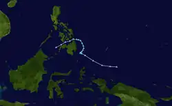 Meanwhile, on November 9, a tropical depression formed near Micronesia. The following day, the JMA began issuing warnings on the system. On November 11, the JTWC upgraded it into a tropical depression, designating it as 27W. By early morning of the next day, 27W intensified into a tropical storm, prompting the JMA to assign the name Usagi. This marks the first time in reliable meteorological records that four active systems were active simultaneously in the basin during November.[9] Around the same time, Usagi entered the PAR, receiving the local name Ofel from PAGASA. The storm continued to intensify and underwent a period of rapid intensification, reaching Category 4-equivalent super typhoon strength on November 14. At 13:30 PHT (05:30 UTC) of the same day, Usagi made landfall over Baggao, Cagayan. After landfall, Usagi began to weaken as its eye became obscured due to interaction with mountainous terrain. After crossing northern Luzon, it emerged into the Babuyan Channel, moving northwestward along the edge of a mid-level subtropical high. The system passed near the Babuyan Islands and northern Cagayan, prompting the JMA to downgrade it to a severe tropical storm. Satellite imagery showed a weakening low-level circulation with convection displaced northeast of a partially exposed center. As Usagi drifted southwest of Taiwan, it continued to weaken due to strong vertical wind shear, leading the JTWC to issue its final warning on November 16. The JMA monitored the system until it dissipated at 12:00 UTC on the same day.