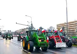 The 2024 Polish farmer protests were a series of protests and road blockades which occurred in early 2024 when Rural Solidarity, the largest farmers' union in Poland, called a strike to protest against the European Green Deal and continued grain imports from Ukraine.[1]