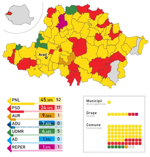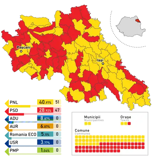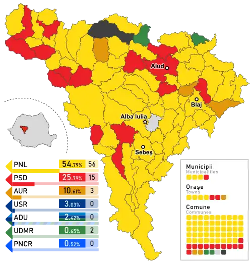 - ^ PNL had entirely absorbed ALDE during late March 2022, therefore the figures associated here with PNL include seats previously won by ALDE in 2020 as well. In addition, the figures here also include a party-switching mayor from AUR who subsequently joined the party in June 2022.