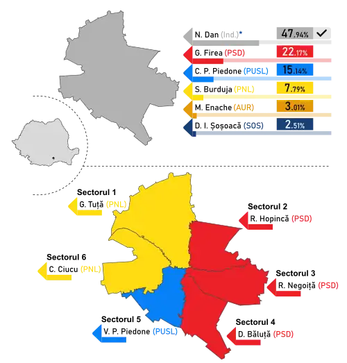 In Bucharest, incumbent mayor Nicușor Dan had expressed his intention to be a candidate again, hoping that he will be supported by the main centre-right political parties which previously endorsed him in the 2020 Romanian local elections.[4][5] However, the National Liberal Party declined to support Nicușor Dan for another term as Mayor of Bucharest,[6] choosing instead to form an electoral alliance with the Social Democrats and back a common candidate, namely Cătălin Cîrstoiu.[7] After a brief scandal surrounding Cîrstoiu however, the two parties decided to run opposing candidates for the Mayor of Bucharest election, maintaining the alliance only at the sector level.[8] Polling indicated the PSD candidate, Gabriela Firea was going to be the main competitor to Dan, who announced he will run as an independent candidate, as in 2020, and received the backing of the ADU and REPER.[9]