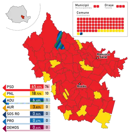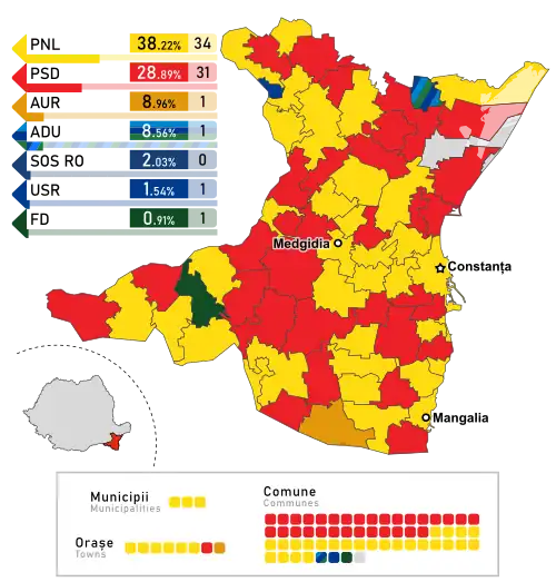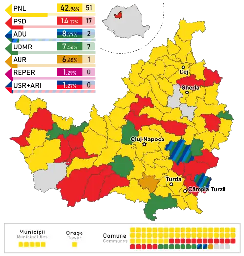 - ^ a b c d e f g According to Romanian law, during local elections, the threshold for electoral alliances with 3 member parties is 8%.