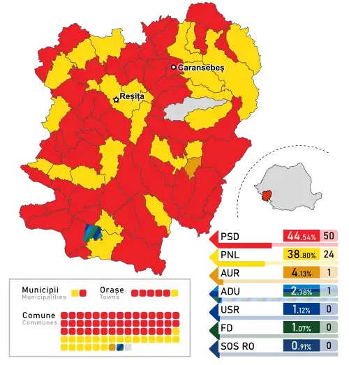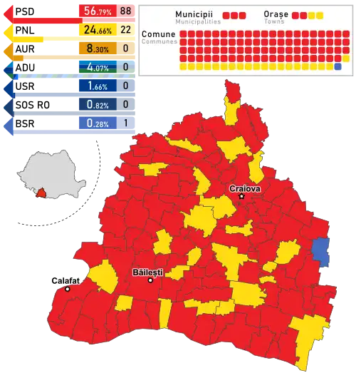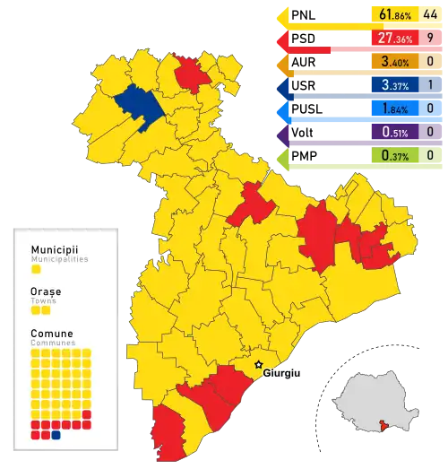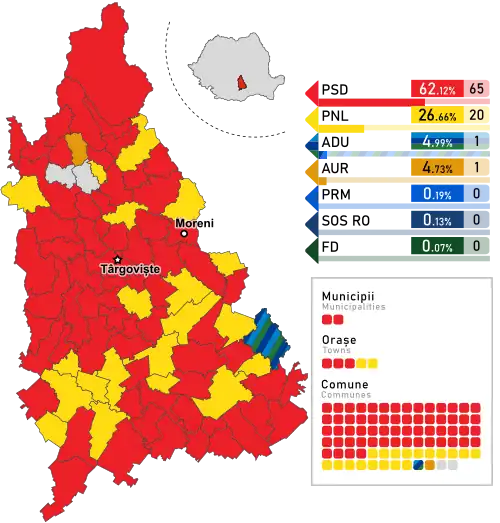 - ^ The total number of County Councilors in the country decreased by 2 since the 2020 election, as Ilfov County gained 2, while Gorj County and Teleorman County lost 2 each