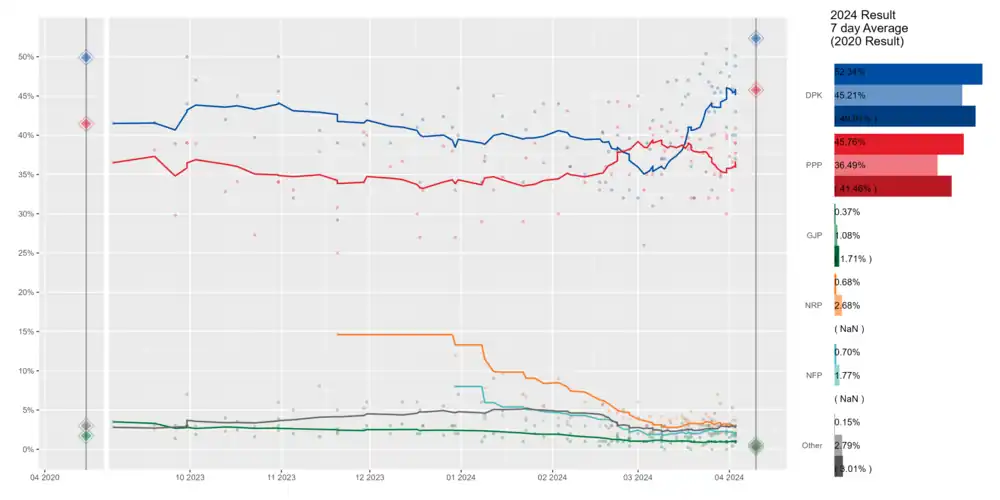 - ^ Including the Basic Income Party in seat totals, which only won seats through the Democratic Alliance proportional list. The Progressive Party won a separate FPTP district, and ran against the DPK in certain provinces.