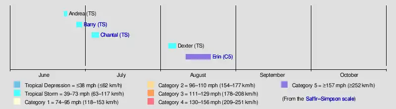 After a nearly month of inactivity, Tropical Storm Dexter developed along a stalled front off the North Carolina coast on August 4 before moving out to sea.[32] Hurricane Erin formed near Cape Verde on August 11[33] and traversed the Atlantic, intensifying into a Category 5 hurricane near the northern Leeward Islands on August 16.[34]
