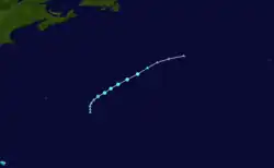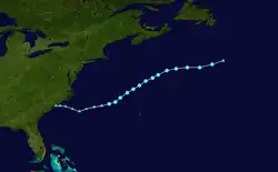 On August 2, a non-tropical area of low pressure formed off the coast of North Carolina.[70] By the afternoon of August 3, the low was producing gale-force winds, and its associated shower and thunderstorm activity was increasing.[71] Later that same day, the disturbance became separated from the nearby frontal zone and acquired tropical characteristics, becoming Tropical Storm Dexter.[72] Dexter formed about 300 mi (480 km) west-northwest of Bermuda; its initial movement was toward the east-northeast at around 12 mph (19 km/h).[73] After formation, additional strengthening was, for a time, stifled by strong westerly wind shear,[74] and the storm appeared to be weakening the next morning.[75] Despite the shear, which increased to 40–45 mph (65–75 km/h) by the morning of August 6, Dexter continued to display convection, and managed to strengthen to 50 mph (85 km/h) due to the influence of an upper-level trough.[76] Dexter completed its extratropical transition the following day, upon merging with a mid- to upper-level trough.[77]
