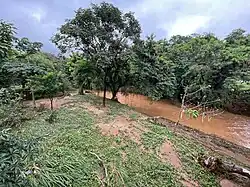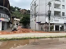 The Taúbas neighborhood in Ipatinga was left isolated as access to the area was blocked.[22] In Santana do Paraíso, landslides interrupted access to the municipality of Mesquita[23] and to the district of Bom Jesus do Bagre in Belo Oriente.[24] In addition to landslides, heavy rains caused flooding and inundations in several locations, with homes, businesses, and public buildings being invaded by water.[25] The overflowing water bodies in Ipatinga, especially the Ipanema stream, which traverses the city, caused floods in various neighborhoods, with Veneza being one of the hardest hit.[26][27]