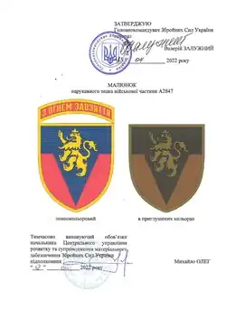 During the Russian invasion of Ukraine, the regiment was deployed for combat operations. On 23 April 2022, the regiment was officially granted a new insignia. The regiment took part in the Eastern Ukraine campaign with a soldier of the regiment (Nazar Shved) being killed near Kamainka on 9 May 2022.[6] On 15 June 2022, the regiment was awarded the honorary award "For Courage and Bravery".[7]