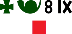 The practice of wearing battalion specific insignia (often called battle patches) in the B.E.F. began in mid 1915 with the arrival of units of Kitchener's Armies and was widespread after the Somme Battles of 1916.[73] The patches shown were worn by the division during 1917.[74] There was no overall division scheme for the battle patches, they were adopted gradually from mid 1916.[75]