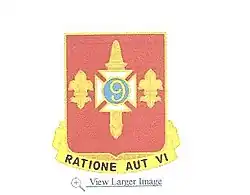 - Symbolism: The shield is red for Artillery. A white cross patée was the badge of the 2d Division, 5th Corps, and a white disk the badge of the 2d Division, 1st Corps, of the Army of the Potomac during the Civil War. The disk has been made blue for contrast, conforming to the heraldic law of not placing metal on metal, and to produce the color combination white and blue, symbolizing the service as Infantry. The sheathed Roman sword, taken from the Spanish War service medal, denotes that the organization served within the continental limits of the United States during the Spanish–American War. The fleurs-de-lis represent the service of the 1st Trench Mortar regiment and the 57th Artillery, Coast Artillery Corps, in France during World War I, which were formed from component parts of the regiment. The number “9” was used by the regiment from the time of its organization in 1859 until 1924. The motto translates to “By Reason Or By Force.”