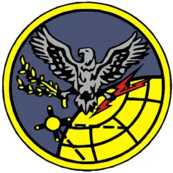 On a blue disc. Issuing from lower right is a yellow hemisphere grid lined black. A yellow satellite in lower left emitting two black dash lines to the sphere; above the sphere and satellite a gray eagle with wings displayed throughout detailed black olive branches in his left claw, a pair of red lightning bolts in the other claw; all within a narrow yellow border.