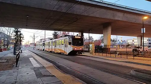 29th Street is a side platformed Sacramento RT light rail station in the Midtown neighborhood of Sacramento, California, United States. The station was opened on September 5, 1987, and is operated by the Sacramento Regional Transit District.[1] It is served by the Gold Line. The station is located on R Street between 29th and 30th Streets,[2] below the overpass of Business Loop 80 (Capital City Freeway). Portions of the Poverty Ridge neighborhood are also accessible from the station.