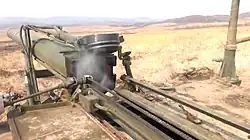 The primary ammunition for the weapon is the high-explosive (HE) 53-F-864 mortar round, which has a total weight of 130 kg (290 lb).[8] The GMWZ-7 fuze can be set either to have a delayed action or to detonate on contact. The weapon uses a five-part propelling charge system, which varies the muzzle velocity from 158 to 362 m/s (520 to 1,190 ft/s) and grants a range of up to 9,650 m (10,550 yd).[8] Another basic type of ammunition used is a HE fragmentation RAP round weighing 228 kg (503 lb) with a maximum range of 18,000 m (20,000 yd). Minimum range is 800 m (870 yd).[2]