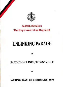 The linked Battalion occupied 4 RAR's lines in Lavarack Barracks upon formation, with the CO from 4 RAR becoming the CO of 2/4 RAR. The linked Battalions of the RAR were tasked with maintaining the customs and traditions from their original Battalions. Upon linking, a combined flag was raised, however the Battalion wore a combination of two lanyards sewn together. A braided lanyard was introduced in 1975.