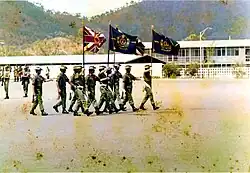 2/4 RAR provided soldiers for 12 Company sized rotations to Malaysia, based at RAAF Butterworth, later became RMAF Butterworth. This was later redesignated Non-Warlike Operational service in the 1990s under the Australian Honours and Awards System. 2/4 RAR also provided three soldiers (2 officers and 1 NCO) to the Commonwealth Monitoring Force in Rhodesia/Zimbabwe transition in 1979/1980. In 1980, 2/4 RAR became part of what was initially known as the Operational Deployment Force along with 1 RAR, it later became known as the Ready Deployment Force(RDF) and then Ready battalion Group (RBG). As part of this, the ODF was reacted on different occasions to provide contingencies for developments in the SW Pacific. In 1988, the Battalion was issued DPCU, this was the first wholesale issue that would change the look of the ADF, along with other Armies, to wearing camouflage clothing as everyday dress. In 1992 to 1993 the Battalion deployed 29 members of the Battalion to Cambodia as part of the Force Communications Unit (FCU), which was set up to provide the communications capability for UNTAC. In 1993, 2/4 RAR being the online Battalion at the time, also reacted 12 Platoon, Delta Company to provide the security element to the Aviation Task Group sent to Cambodia in support of the UN run Elections. In 1993, 1 RAR was reacted to form the basis of a group (1 RAR Bn Group) to be sent to Somalia, as with both Battalion's at the time they were never at full strength, thus 54 soldiers (Privates) were sent to 1 RAR to fill their gaps for their deployment to OP Solace as the 1 RAR Battalion Group. In 1994 after the failure of UNIMIR, the Australian Government decided that it would support UNIMIR II, providing the medical capability for the new Mission. This meant that A Company, 2/4 RAR was warned for service in Rwanda and 2/4 RARs 'Samichon Lines' became the mounting base for the deployment. A Company deployed to Rwanda in August and just prior to Christmas the decision to unlink 2/4 RAR was made. On the 1st February 1995, 2/4 RAR conducted an unlinking parade in Townsville. 2/4 RAR did not provide troops to 4 RAR or split the Battalion, it became 2 RAR wholly. At the same time that the unlinking parade occurred the deployed elements of the Battalion also conducted unlinking parades, with D Company in Malaysia at RMAF Butterworth on Rifle Company Butterworth, A Company in Rwanda on OP Tamar and elements of Support Company supporting an Army Reserve Exercise at Shoalwater Bay.