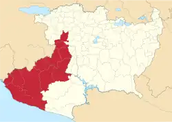 - Aguililla, Apatzingán, Aquila, Buenavista, Chinicuila, Coahuayana, Coalcomán de Vázquez Pallares, Los Reyes, Peribán, Tancítaro and Tepalcatepec.