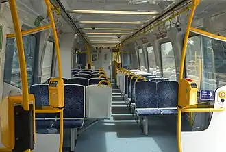 Two headlights are mounted at the top of the car in the centre on driver's cab ends. There are no marker lights at the front; however, there are red marker lights for the rear located on the upper corners. There are metal steps up the side of the car to each door, but they are not used by passengers, however in emergency situations, they may be used to allow passengers to disembark from the train. They are illuminated by lights at night. All cars are air-conditioned.