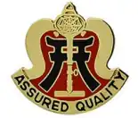 A gold color metal and enamel device 1 1/8 inches (2.86 cm) in width overall consisting of a black Torii gate surmounted by a gold spanner within an encircling gold scroll inscribed “ASSURED QUALITY” in black letters, the ends of the scroll terminating at the head of the spanner, all on a crimson background. The DUI was approved in 1969 for the 303rd Maintenance Battalion and redesignated in 2009 for the 303rd Ordnance Battalion (EOD).[13]