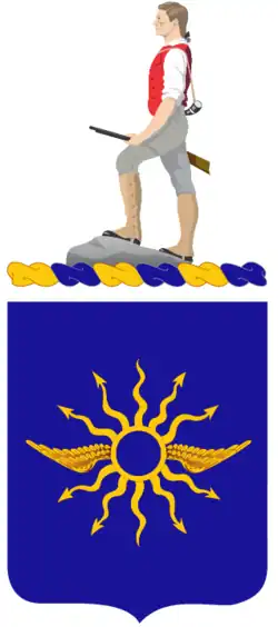 The regiment's coat of arms and distinctive unit insignia were both approved on 11 March 1927. The distinctive unit insignia consisted of the winged thunderbolt symbol of Tallmadge's Dragoons, a Connecticut Revolutionary War unit. The thunderbolt was located inside an azure bezant and annulet with the unit's motto, "Pata Concita Fulmnt Nati" (The Fatherland having been aroused, its sons thunder forth), which was the motto of Tallmadge's Dragoons. The coat of arms consisted of a blue shield with the winged thunderbolt in the center. The blue copied the color of one of the Tallmadge's Dragoons flags, and the Organized Reserve's Minuteman crest was located above the shield.[4]