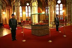 The regiment has provided sentries at the gates of the Sándor Palace (the official residence of the President of Hungary) in Budapest in a Guard mounting ceremony since the Hungarian People's Republic's disestablishment in 1989 and President Ferenc Mádl's move in the palace in 2003.[14] The sentries come at 12 pm in a team of six while only two them will actually take up the guard. A drummer and officer are also present.[15] Another guard changing ceremony is held inside the Domed Hall of the Hungarian Parliament Building on Kossuth Square, where guards protect the Holy Crown of Hungary. This has been done since 20 August 2012.[16]