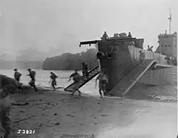 The embarkation was undertaken in two waves. 'C' and 'D' Companies boarded Landing Craft Infantry (LCI) vessels at Kukrum early on 25 October, while 'A' and 'B' Companies boarded High speed transports (known as APDs) the following day.[33] In the early hours of 27 October, following a naval bombardment of the Japanese positions around the village of Falamai on the southern coast of Mono Island[34] the 36th Battalion went ashore on the left flank of the 29th Battalion.[35] 'A' and 'B' Companies landed unopposed to the west of Falamai in between the Saveke River and Cutler's Creek[29] at 6:26 am and after organising themselves on the beach, they advanced inland in order to vacate the beach for the 'D' Company, which came ashore in the second wave at 6:46. While these forward companies moved inland, 'C' Company began the task of unloading stores on the beachhead. This was completed within 20 minutes.[34]