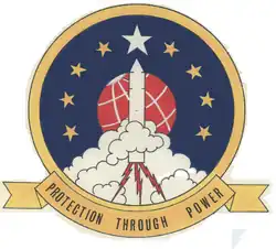 - ^ Approved 23 April 1963. Description:On an Air Force blue disc bordered Air Force golden yellow, a reddish-orange globe, axis bendwise, grid lines and polar area white below an arc of nine stars, a large white one in chief, four Air Force golden yellow ones on either side, issuing from base and surmounting the lower portion of the globe, a white cloud formation; piercing the cloud a white missile in upward flight palewise emitting three red lightning flashes radiant to base; outlines and details Air Force blue throughout. Below the disc on an Air Force golden yellow scroll, the motto edged and inscribed in Air Force blue. Significance: Against a background of ultramarine blue and golden yellow, a missile, clouds, the earth, and lightning bolts all indicate instantaneous, powerful reaction of global proportions. The nine stars represent the nine missile complexes originally assigned to the squadron upon activation. The large white star represents this unit's goal of achievement.