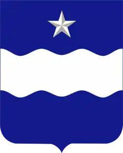 This Regiment was organized at Fort Sam Houston in 1916 and served along the Rio Grande during its first years. The shield is blue for Infantry, with a wavy fess to denote the Rio Grande and the lone star of Texas.