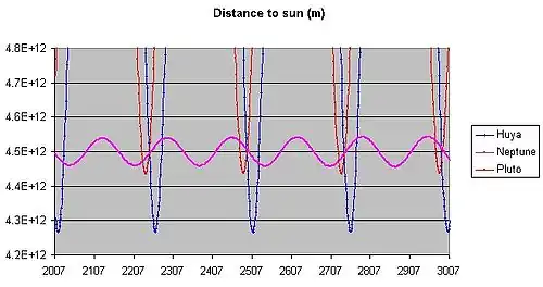 - ^ a b "Horizons Batch for 38628 Huya on 2014-Dec-14" (Perihelion occurs when rdot flips from negative to positive). JPL Horizons. Retrieved 2023-08-27. (JPL#42/Soln.date: 2023-Jul-28)