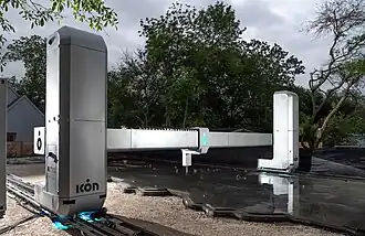- Gantry robots: Gantry robots are the most common in 3D concrete printing, and consist of a mobile gantry system with mixing and deposition systems. They can range from small lab models to large-scale printers for printing full components or structures. These printers are typically limited to vertical extrusions but have the benefit of high stability and easy scalability for larger projects. Gantry robots must be larger than the assembled structure, which can add cost to transportation and set-up costs.[12] However, they are the easiest to control of all 3D printers.
